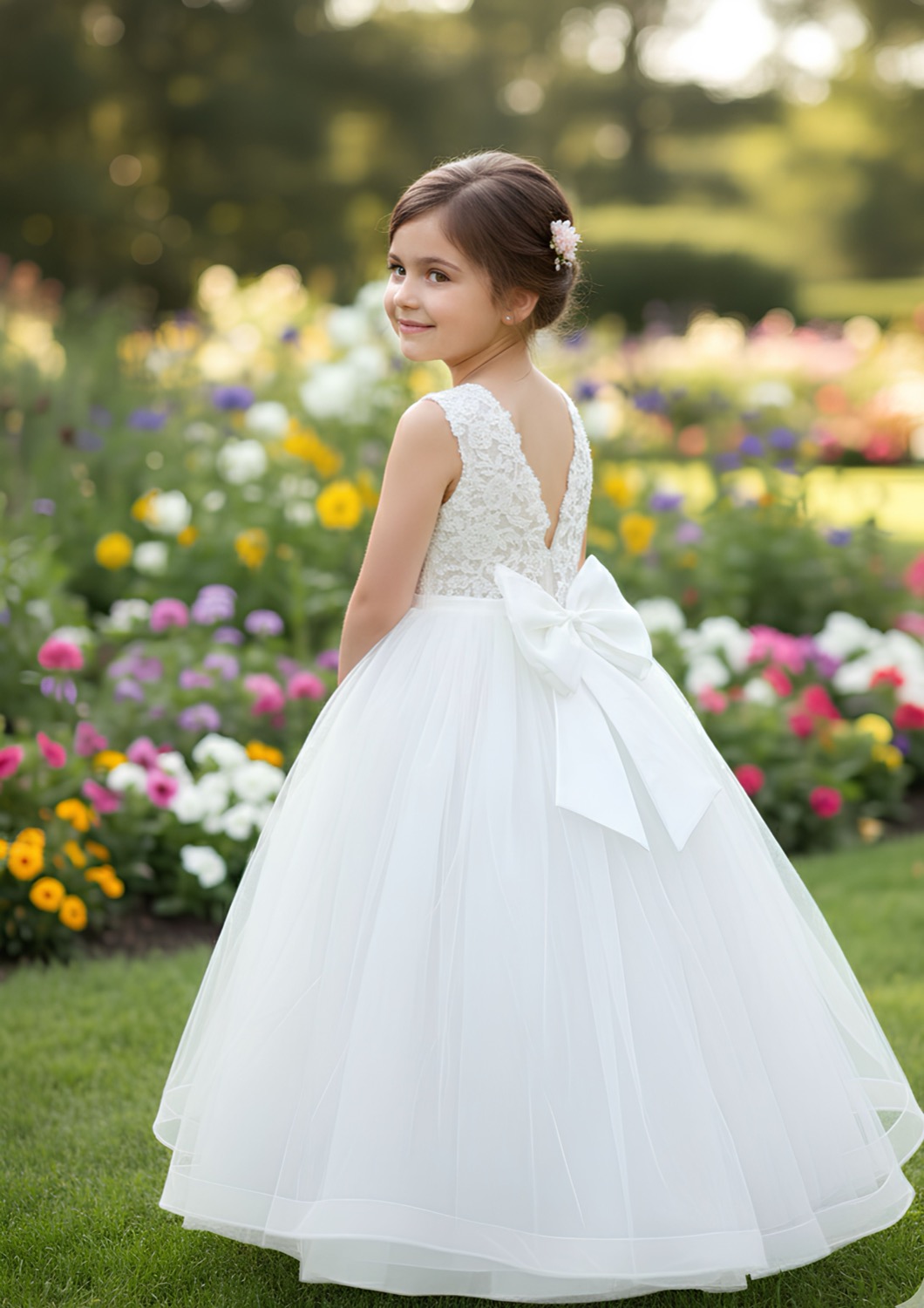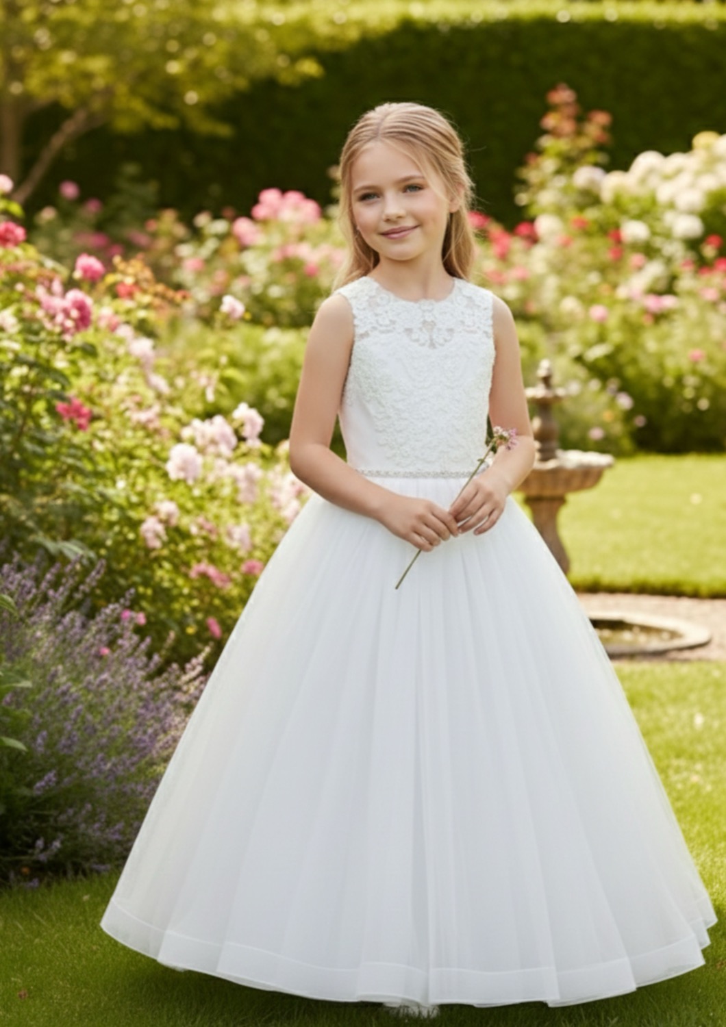 Ideale per Comunione o Damigella Matrimonio, l’abito Diamante Bianco incanta con la sua eleganza raffinata.