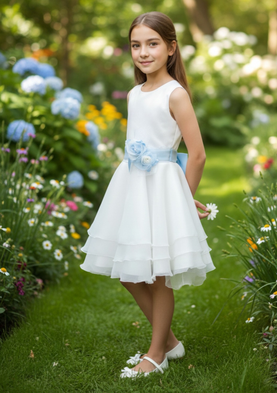 Ideale per Comunione, Cresima o Damigella Matrimonio, l’abito Perla Bianco esprime un’eleganza raffinata e intramontabile. Realizzato interamente in organza, è impreziosito da una cintura celeste, arricchita da un delicato fiore coordinato. Sul retro è presente un grande fiocco in organza già pronto per avere un risultato perfetto senza sforzi.